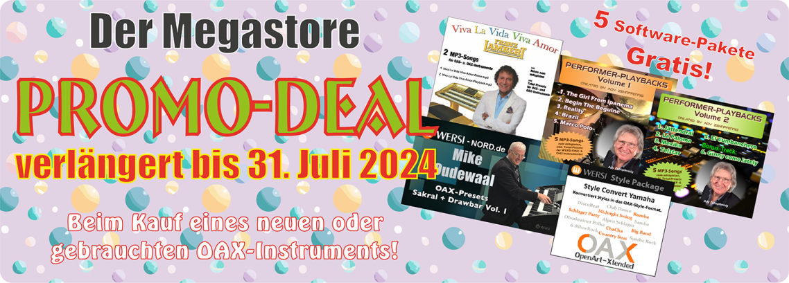 Anlässlich des Events "50 Jahre WERSI" auf Schloss-Gartrop in Hünxe, hat der bekannte Organist Mike Oudewaal in der Schlosskapelle die WERSI OAX-700 mit der virtuellen "Silbermann-Orgel" und den neuen "OX7-2" präsentiert. Auf Anfrage vieler OAX-User gibt es nun einige der Registrierungen in Form von Total-Presets. Spielen Sie die klassischen Sakralstücke oder swingen Sie mit den neuen Drawbar-Sounds. Mit den Spezialeinstellungen von Mike Oudewaal kein Problem!