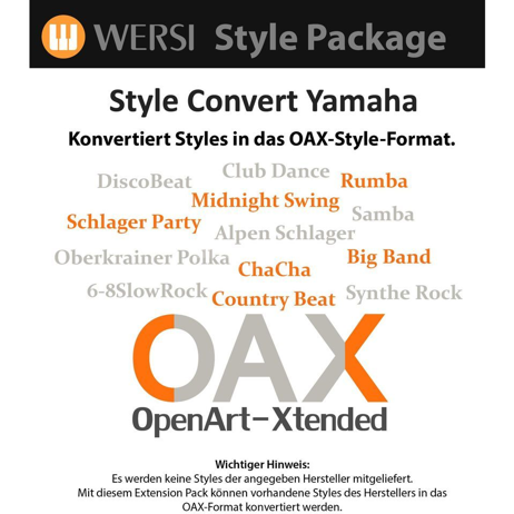 Style-Konvertierung von Tyros 3 bis Genos. Mit diesem Erweiterungspaketen haben Sie die Möglichkeit Styles von YAMAHA in das WERSI OAX-Format zu konvertieren. Somit steht Ihnen eine Vielzahl an neuen Styles zur Verfügung. Bei einer Konvertierung werden die Spuren der Begleitautomatik und die Schlagzeug-Noten in das OAX-Format übernommen.