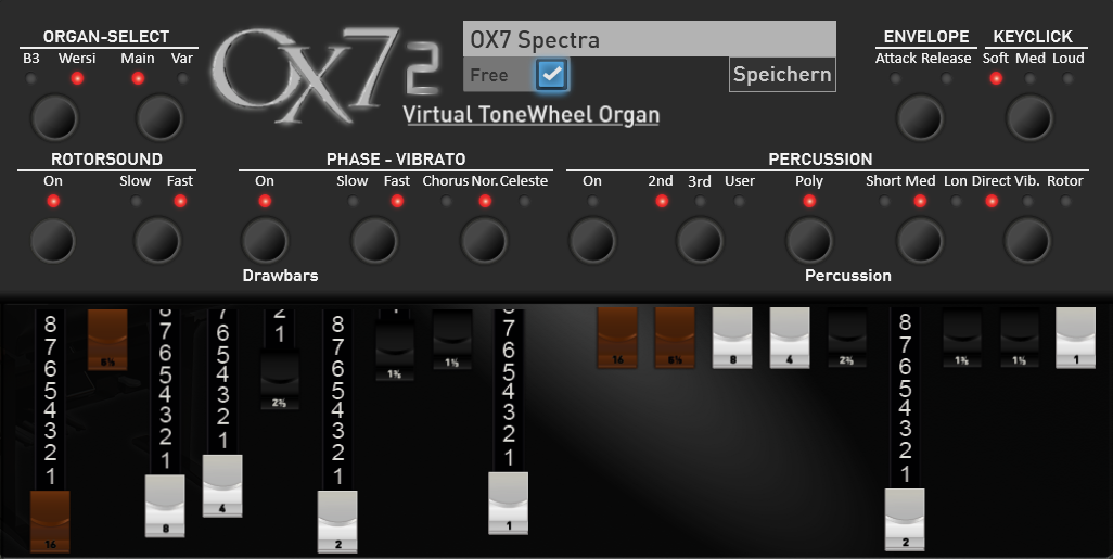 In den letzten Monaten haben wir den Klang der OX7 Zugriegelklangfarben komplett geändert. Freuen Sie sich auf einen neuen frischen WERSI Zugriegelklang mit dem OX7-2. Optisch hat sich zunächst einmal nicht viel geändert. Die Oberfläche hat einen neuen dunkleren Hintergrund bekommen. Die Funktionen sind identisch zum alten OX7.