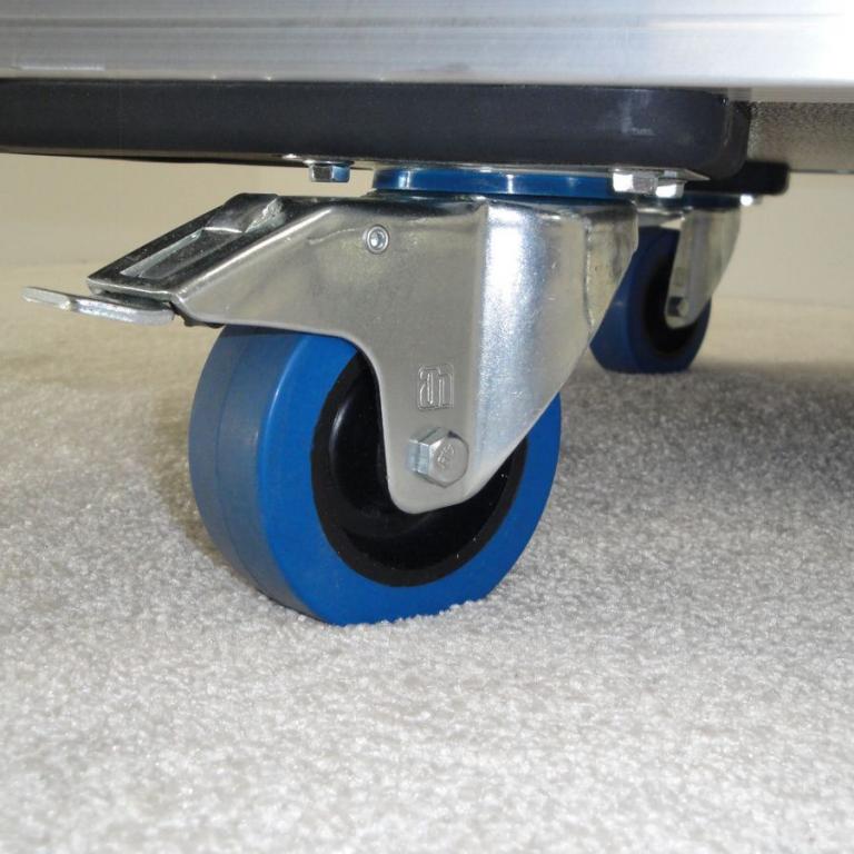 hochwertige Leichtlauf-Rollen mit Feststellbremse garantieren eine gute Fahrt vom Transportfahrzeug bis zur Bühne