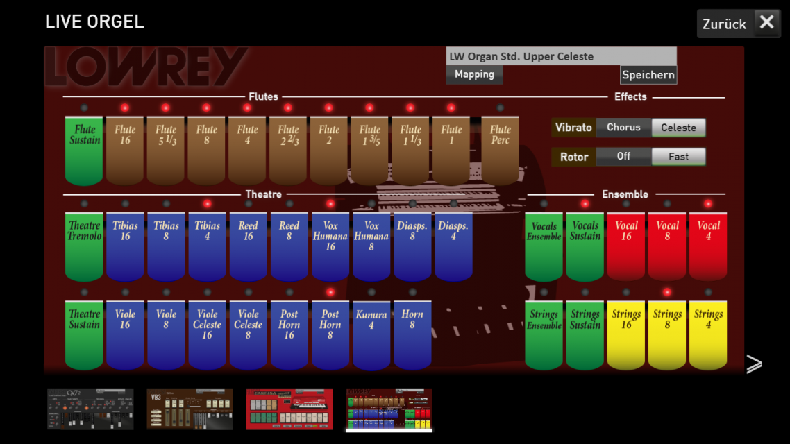 Erleben Sie den Klang der legendären LOWREY Orgel auf Ihrem OAX-Instrument. Über die Live Orgel Oberfläche schalten Sie die Tabs für die Fußlagen der Zugriegel, die Tabs für die Theater Klangfarben und jeweils drei Fußlagen Streicher und Vocals. Sowie Vibrato, Rotor, Tremolo, Sustain und Ensemble.