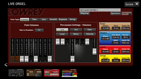 Erleben Sie den Klang der legendären LOWREY Orgel auf Ihrem OAX-Instrument. Über die Live Orgel Oberfläche schalten Sie die Tabs für die Fußlagen der Zugriegel, die Tabs für die Theater Klangfarben und jeweils drei Fußlagen Streicher und Vocals. Sowie Vibrato, Rotor, Tremolo, Sustain und Ensemble.