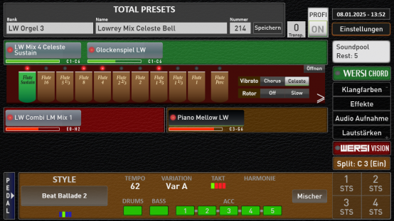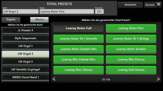 Zusätzlich zur Lowrey Live Orgel sind 82 weitere LOWREY Klangfarben, 64 Effekt Sounds und 4 Hallprogramme vorhanden. Möchten Sie direkt loslegen und den Lowrey Klang in seinen vielfältigen Facetten ausprobieren, nehmen Sie am besten die Total Presets im Werksbereich. Diese finden Sie in den Total Preset Banks mit der Bezeichnung Lowrey Orgel 1 bis 3 und Lowrey Variable Zugriegel.