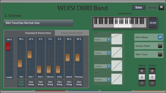 Panorama, Hall, Dynamik und die Klangkontroller sowie Dynamik, Oktave und weitere Werte, die Sie bereits auf von den Selektoren kennen.