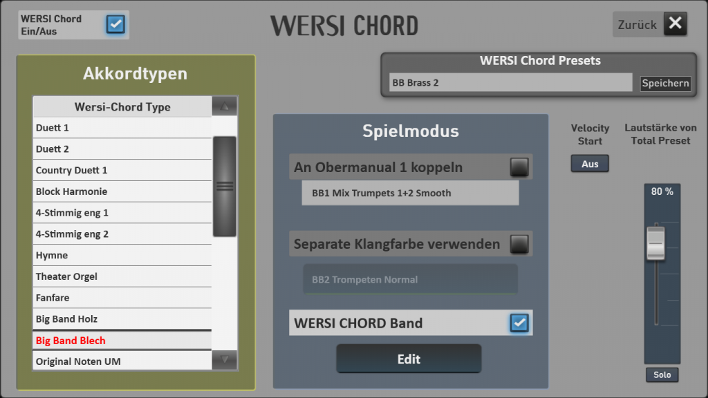 WERSI Chord Band verteilt die einzelnen Stimmen eines Akkords z.B. auf die Klangfarben Trompete, Posaune und Saxophon und es entsteht daraus ein Big Band Akkord.