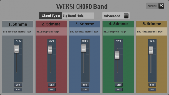 Bei dem bisherigen WERSI Chord, wurden die erzeugten Note mit nur einer Klangfarbe gespielt. Diese Spielweise entspricht nicht die einer Big Band oder eines Orchesters.